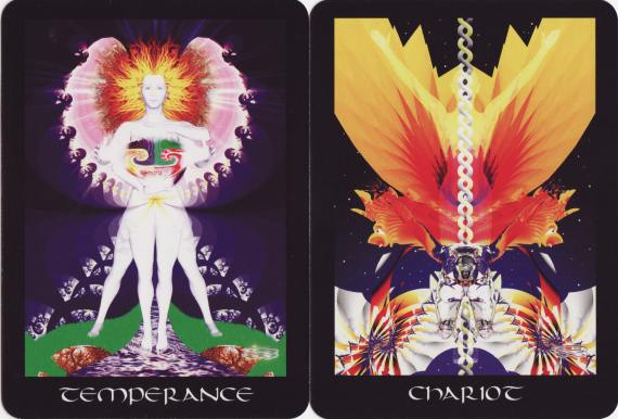15th Oct 2007 The Halo/Sharp New Energy Tarot Deck is one of those half tarots, with some of the 22 cards (I counted eight) obviously related to the conventional tarot imagery, with the others wandering off into unknown territory. The title Halo/Sharp could seem enigmatic, until one reads the box, which tell us that the artist is Oxo Halo and the writer of the associated book is Dr Michael Sharp. The artwork is computer graphics, collaging photographs and computer generated mannikins, interwoven with Mandelbrot and Julia fractal patterns. Many of the surfaces are rendered with interesting textures, though even with this I found the mannikins rather flat and unconvincing. As to what it has to do with 'New Energy' I am not sure, I suppose that is all explained in the book. The artwork is colourful and highly geometrically structured.