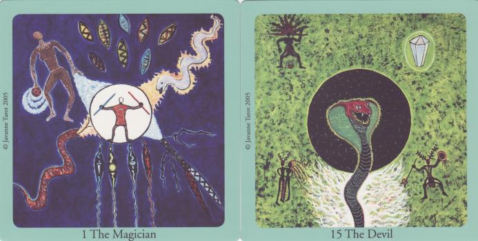 20th July 2007 I sparked off quite a long discussion on the Aeclectic Tarot forum when I posted my criticism of the African American Tarot recently issued by Lo Scarabeo. The responses made me realise just how 'engineered' the tarots produced by mass-market publishers can be, and the ways in which the deck design is essentially contrived, thought-out, scripted and handed to an artist to turn out images in the requisite style. Thus the centre of the creative work on a tarot deck here moves to the commissioning editorial group and far removed from the artist. My own tarot publishing venture works differently. I look at an artist's work, and if I like it I will offer to publish it in deck form. I do not attempt to rework the imagery and will only make suggestions about borders, card backs, titles and so on, but leave the final decisions to the artist. For me the artist is central to the production of a tarot deck and I don't see why I should dictate the agenda. If I like the artwork then I will take the financial risk of publishing it. Some of the tarots I have produced have not sold well, and the project is only now becoming marginally profitable, but it is great fun to be involved in the birth and publication of a new deck. The mass-market publishers often seem to be focussing on creating issue decks aimed at niches in the market, specialist interest groups, etc. They do not seem primarily interested in the artwork in itself. So it is left to people like myself and the many self-publishing tarot artists to keep the wonderful artwork of modern tarot alive. 19th July 2007 The Javanne Tarot from Denmark is a most unusual square tarot which I only recently discovered. (Another square tarot that comes to mind is the Mandala Astrological Tarot of Tadd Mann.) The deck is published by Karen Javanna who worked with the artist Annelie Zofia over many years to create this deck. The imagery is non-standard, and each card of the Major arcana has symbols at each corner as well as the central image which is usually recognisably derived from the conventional tarot arcana image. The book by Karen Javanna that accompanies the cards outlines the complex system that she has devised to read the cards. Each card has four positions, which gives a different reading to the card symbols. This must be one of the more creative and unusual reworking of tarot in recent times.