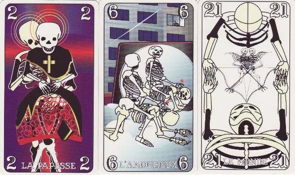 29th Oct 2007 Sometimes I take a chance on buying some tarot deck I have never heard of before and cannot find any information about. Often these turn out to be standard reprints of the Tarot of Marseilles. I found one of these mystery tarots recently called L'Arcane sans nom. On glancing at the rather small image on the online auction it appeared to be a French Jeu de Tarot (for playing the card game), but the images on the Major arcana appeared to have the usual tarot structure, rather than the game trumps. The deck arrived earlier today and it is rather interesting. The arcana without name is, of course, the death card. This deck has a black card for the death card, but all the other 21 Majors have a skeleton as the basis for their imagery. The deck is numbered '28' which suggests a limited edition and is produced by the charming 'Fuck Off' company in Bordeaux.