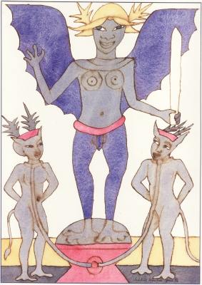 25th May 2007 There are many different kinds of collectors of tarot. Some see oracles and other such decks as part of the tarot phenomenon, while others, like myself, like to see at least some semblance of tarot structure. Some people will only collect full 78 card decks, while others take delight in Majors only decks as well. Some will only collect actual printed decks of cards, while others like to collect tarot designs in other media, such as illustrations printed in books. I am in the 'others' camp, so today I was delighted to receive from my postman a large hardback book, some 12 by 9 inches, with a set of 22 designs for the Majors in full page size. This is Le Tarot d'Amour by Christine Lesueur, published in France in 1985. The artwork closely adheres to the classic Tarot of Marseilles but has a nice upbeat style, with each of the human figures bearing a sort of self-satisfied smile (which one might almost describe as a smug expression). The lines of the drawings were made in a water soluble ink, which when coloured with watercolours have bled and feathered into the paper, which is a rather nice effect as it reduces the contrast of the lines to make smoother transitions, and a softer effect to the imagery. Those who just don't like tarots printed in books are here missing out on some fine art. The figures are all dark skinned.