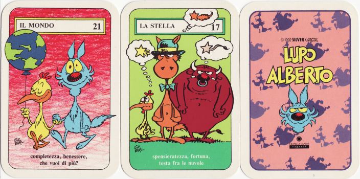 7th June 2007 Over the past few days I have mentioned some real heavyweight art tarot, but tarot art is broad enough to encompass many other facets. So I would just like to show here the Italian Lupo Alberto Tarocchi which I recently obtained. This is based on an Italian cartoon character Lupo Alberto (he is a wolf, though not a particularly convincing one to me as he seems a bit more like a hare or rabbit, but I am told he is a wolf). Apparently it is one of the most beloved and distributed comic strips in Italy. There are a series of stock characters. One of the dynamics of the story is that he always tries to steal a hen named Marta, who is his fiancée but Mosè a watchdog tries to prevent him. The comic strip first appeared in 1974 and this tarot, based on the main characters, is from 1992. Apparently some later versions of the cartoon strip segued into political satire. One of the characters, Henry the Mole, is represented with the attitudes, slogans, and even physical features typical of Silvio Berlusconi. The Tarocchi does not incorporate this satirical aspect but merely presents some of the key characters in the comic strip and attempts to link them to the Major arcana images.