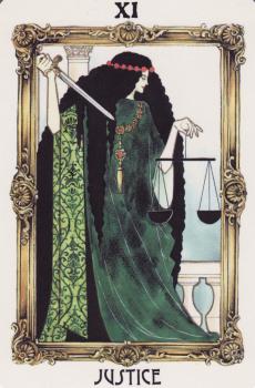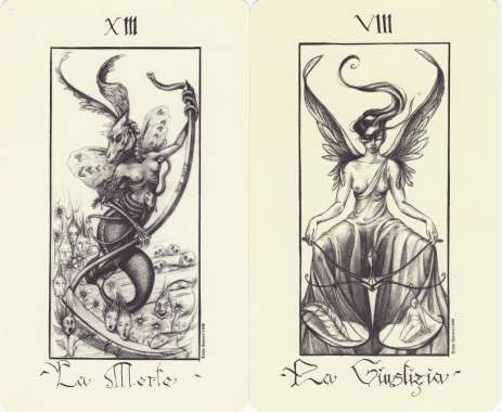 10th June 2007 Those of us who have bought the sometimes weird but usually wonderful tarocchi produced by the Italian company Il Meneghello know well the little book-like packaging boxes tied with bows. The seasoned collector realises that it is folly to untie these bows as you never quite get the tying right again, and in any case the cards actually slip out of the little book form without the need to unknot the bows.It came, therefore,as a pleasant surprise to see Lillie's Tarot of Aubrey Beardsley came in the same sort of packaging. Lillie chose to use some of the chapter headings from Beardsley's Mort d'Arthur (1894), which she has in places judiciously edited, for her majors only deck. She has certainly done a great job in selecting the illustrations for each tarot card as they all seem to naturally reflect the arcana.