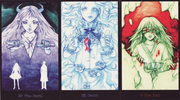 26th July 2007 On the 1st May 2007 I described the Namoo Tarot, also called the Midnight Tarot, as I was surprised that this tarot, published in Korea, apparently had some connection with the Pacific island of Tonga. Today I received the Nunc Dimittis Tarot also published in Korea, though the box states "2003 All rights reserved by Attica http://attica.lil.to", again the connection with Tonga. 'Nunc Dimittis' is the opening words of a Liturgical Canticle or song extracted from the second chapter of the Gospel of Luke which can be translated "Now, Lord, you let your servant go in peace". I am not sure of the context of this deck, whether it is associated with a band or some computer game, but its art is more gothic than Christian, so the 'Nunc Dimittis' reference must be ironic. The backs of the cards are solid black with the sentence in red "In solitude, whatever one has brought into it grows - also the inner beast", which is quoted from Friedrich Nietzsche Also Sprach Zarathustra, 1892, and certainly is a more gothic sentiment. The card designs appear to be in water based acrylic on textured board, with soft washes contrasted with saturated areas of colour. The Fool with one eye blinded and bleeding breaks through a glass wall. Death is also rather orginal with the body of a young woman floating face up drowned in water on which float flowers and petals. One only becomes certain of her immersion in water when one pays attention to the bright red fish swimming above her body and casting its shadow. The image of the Devil as puppetter has been used before, but here it is rather nicely realised as an image. This is a wonderful art tarot of Majors only. I cannot understand why more people are not drawn to collect this amazing artwork.