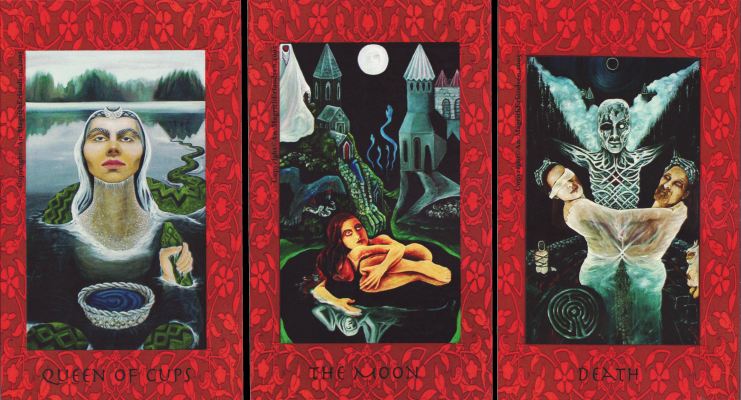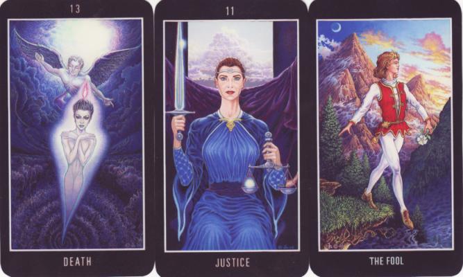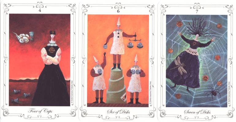 6th June 2007 Le Tarot de Camargue or Lou Tarot de Camargo hails from the South Eastern region of France. It is the work of Jo Demonflin. She has created a full 79 card deck (she includes an extra arcana 23 'The Four Elements'). The outlines of her designs have been drawn in coloured pencil, then brightly coloured and with dense textured backgrounds. In many cases she depicts the faces of the figures without features and having only one eye (usually only the left is shown). The artwork style is a little bit reminiscent of some of Picasso's or Chagall's work, though in no way copied from these. One of the amazing features of this deck is the use of Langue d'Oc (or Occitan) for the titles of the cards. Thus the Magician is 'Lou Mesteirau', the Fool is 'l’irraciounau', the Chariot 'La Tirasso', Death (Metamorphosis) 'Lou Tremudamen', and so on. I have put up her website on my list of other tarot publishers in case you might like to buy a copy from her. It is a rather beautiful and unusual deck. Flamingos and bulls, for which the Carmargue region of France is famous, are both prominent symbols on the cards. ![]() 5th June 2007 Creating a tarot deck is quite a task. It is difficult enough to find the time to create the 22 majors but a full 78 card deck can be an enormous investment of ones life energies. Add to that the intention to create this as a series of oil paintings and we are talking years of concerted work. An-Magrith Erlandsen has found a new solution to this problem. She is selling her Tarot of the Pomegranates as an incomplete deck and will send on the remaining cards in batches as she finds the time and inspiration to complete the paintings. Her paintings are wonderfully detailed in saturated colours. She is very creative and comes up with some new ideas for the tarot images. Her Queen of Cups is a powerful engaging image with the head emerging from the waters of a still lake. The Moon card has a astounding picture of a female figure emerging from the dark pool and protecting another figure. The Magician is another amazing image beautifully painted, while her death card depicts a skeleton form, standing between two shrouded human figures, its bones forming a celtic knotwork, a truly original conception. An-Magrith's paintings are very beautiful. I only wish I could afford to buy one. However, I do have the next best thing - a set of her tarot cards. I have put up her website on my list of other tarot publishers in case you might like to buy a copy from her. It is a signed edition of only 200 and I have number 8. ![]() 4th June 2007 There has been quite a spate of dark magical tarots produced recently, emerging from magical groups inspired by such as the OTO and other magickal groups. So we have seen a Satanic tarot, the Abysmal Tarot, the Sinister tarot, among others. Now I hear of the immanent publication of a 'luciferian tarot'. Today the Bestian Tarot arrived from Slovakia. It is a full 78 card deck, and each card has a black background with the image set in the central space. The imagery is computer collage based on photographs, images from paintings and engravings, astrological and other sigils, and some forms drawn in a computer graphics program, all melded together and processed though filters to give strong resonant images. Each image seems to act like a nimbus of light illuminating the dark space of the card. This is a rather fine production. It is in a small edition of only 50 copies, so will appeal to collectors and others drawn to this esoteric imagery. ![]() 1st June 2007 Today I completed the Fortuna's Wheel Tarot and now have these up for sale as item 13 in my Art Tarots series. My first tarot decks were issued in April 2006, so in just over a year I have produced thirteen decks. I think I may deserve a short rest! I have a number of other marvellous decks in production, though these will probably have to wait till after my Alchemy symbolism art exhibition in Edinburgh in August. Nigel Jackson's new tarot has wonderfully luminous colours, this effect being achieved by the careful choice of colour tones in each of the cards and the clean lines of the drawings. It was quite amazing this afternoon when I was collating the cards into decks. I did this on a large double table which allowed 100 copies of the cards to be dealt out onto piles. 100 cards appearing face up at a time was quite a spectacular show. I wish now I had photographed that. 31st May 2007 Nearly finished the Fortuna's Wheel Tarot. Spend much of the week cutting the sheets into cards and today I made up the boxes, pasting the image on the lids and glueing in the lift tape. Now all I have to do is make up the cards into sets. 28th May 2007 The last three days have been spent laminating the copies of the latest tarot, number thirteen, in my Arts Tarot Series. This is the Fortuna's Wheel Tarot by Nigel Jackson, the well respected creator of the Medieval Enchantment Tarot. For some inexplicable reason Nigel could not find a publisher for a deck, though this was issued in book form as Fortuna's Wheel: The Mysteries of Medieval Tarot. A few months ago I agreed to print up his artwork into deck form in a limited edition of 100 copies. The artwork is in the same style as his earlier Medieval Enchantment Tarot, with finely drawn forms coloured in subtle luminous colours. I still have a few more days work cutting out the cards and making them up into boxes, so I should be announcing this for sale by next weekend. Here are images of two of the cards. I will set up a page on my web site later this week which will give more details.