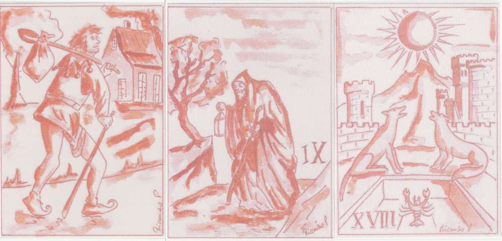 22th May 2007 A week ago I received the recent batch of tarots from Lo Scarabeo. I have almost all their decks including the early Tarocchi d'Arte series begun in the 1980's. They have oriented themselves since the 1990's into producing pastiche and themed decks. Some of these work extremely well, the Bosch, Dante, Durer, Giotto and others in this style are magnificent, as are their suite of Egyptian styled decks. Some of their themed decks also work well, the grim and dark Gothic Tarot of Vampires, the neo art nouveau Universal Fantasy, among many others. Last year I was rather disappointed with their Tattoed Tarot with its rather flat and contrived artwork. One just has to watch a couple of episodes of the TV documentary series Miami Ink to realise the power and originality of modern tattoo artists, and the Lo Scarabeo deck just seems trite compared with real tattoo artwork. One of their recent offerings has also disappointed me - the Tarot of the Elves. It is a great idea to do a tarot on that theme, but surely not with such horribly static artwork. The figures are not painted but created using one of those computer graphic programs. This produces mannikins in rigid poses and blank expressionless faces. The Hierophant is totally unconvincing, and almost like a window display in Debenhams department store. Elves, to my understanding, are mischievous, animated nature spirits, not expressionless dummies. The Seven of Cups and the Two of Wands are just such bad images! One might be excused for taking this as a satire on the modern reinvention of mythological figures, but sadly I suspect Lo Scarabeo designers were being serious and not tongue in cheek. With all the amazing tarots they have created over the years they can be excused a sour lemon or two, but how on earth did they let a massive turkey like this slip through! I may have to put this one in my 'humorous tarots' section. 15th May 2007 Yesterday I received two French tarots which are totally different in form and style. Firstly, the rare Le Tarot de Saint-Jacques, created by France Poëhr apparently in the 1990's and issued in a signed and numbered edition of 100 copies. The Saint Jacques would appear to be St James of Compostela, as his symbol of the shell appears on the backs of the cards. This shell was the symbol for the famous mediaeval pilgrimage to the Cathedral of Santiago de Compostela in Galicia in northwestern Spain, where the remains of the apostle, Saint James the Great were laid. Poëhr, the creator of this deck, must have had this in mind when he constructed the images, however, there is no straightforward connection between the stages of the Pilgrimage and this tarot. Interestingly, in 2004 Juan Martinez Casasus created a deck, El Tarot de la Y directly reflecting this Pilgrimage. Poëhr is more obscure, instead collaging complex images for his major arcana. These appear to be paper, scissors and glue collage rather than made using graphic software, though they are extremely skilfully done, with none of the clumsy cut edges which can make some stick-on components in collage stand out. Here the images blend together seamlessly. One has to see the cards to appreciate this as scans for the computer do not do them justice. The images are wonderfully complex and balanced and cannot be grasped in a quick glance. The symbolism is mysterious and engaging. ![]() The very same day I received a Tarot, which was just completed a week or so ago. This watercoloured deck was made by Ricardo P. and uses a single colour, an earthy reddish brown, close to a burnt umber. He uses this in three strengths, a saturated colour to draw the lines of the forms, a dilute wash to fill in the forms and an intermediate strength to give some modelling. This restraint and restriction of pallete does produce a unique style. The images are completely conventional with little departure from traditional forms. One appreciates this hand-made deck for the medium it is executed in, rather than any creative reworking of tarot imagery. I find it rather special, and a complete antithesis to the intricacies and detailed obscurities of Poëhr's collages. Tarot is a broad church indeed.