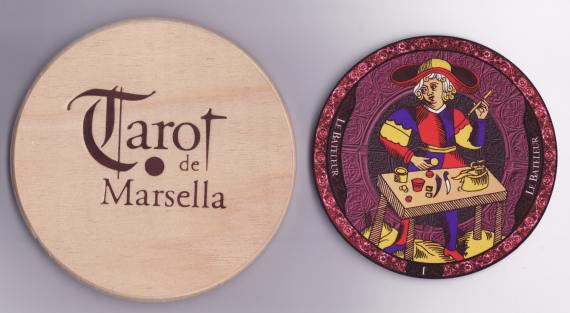 16th Oct 2007 Today a new tarot arrived from Argentina, the Tarot de Marsella. This is a round version of the well known Tarot de Marseilles. The imagery on the cards is not original but entirely derived from this classic deck, and merely adapted to the space. Each image is superimposed upon a background of 16 roundals (which is doubled on the Majors). This backgound is tinted differently on each of the four suits. The deck comes in a neatly crafted round plywood box. It is remarkably inexpensive, and yet another deck to arise from South America in recent years.