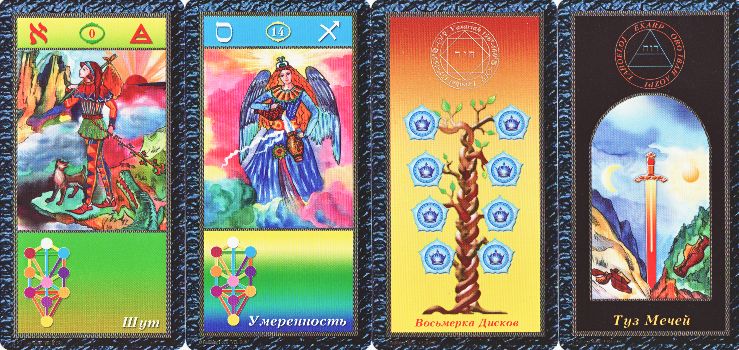 23rd Aug 2007 There seem to be few collectors of Russian tarots. Perhaps some people have the idea that the Russian publishers specialise in rip-off versions of US and European decks, but in this opionion they are far off the mark. There are indeed many exciting and original Russian tarots. Recently I acquired a copy of the Tarot of Magical Symbols issued in 2006 by the publishing house of Veligor in Moscow. The artwork is by E.B. Butina and the deck was conceived by A.V. Sanarov (please excuse my transcription from the Russian should I have made some error). The artwork is coloured pen drawings. The line drawing is very fine, and these have been painted in intense saturated colours. These appear to be some water based pigments, but are very bright and intense. On the Majors, the image does not fill the whole space on the card, but there is a small border above, bearing the Hebrew letters and astrological signs, while below is a larger panel with a Kabbalistic tree of life and the card title. There also appears to be a clear use of magical colour associations in these panels. The imagery of the Majors seems to be drawn from the G.O. Mebes designs, but in no way slavishly follow these. Although the pip cards are not emblematic, the artist has introduced some little unique variations on some of the cards. Each of the Minors is connected with the decanates of the Zodiac and one of those strange 'angelic' names from Hebrew inspired European Renaissance magic. This deck comes with a book, in Russian of course, where the whole complex system is explained.