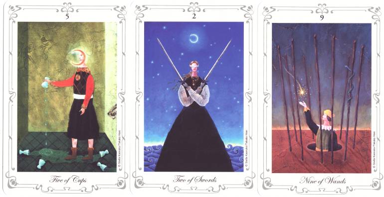 7th July 2007 I few years ago I bought the delightful Stella's Simple Tarot. This was a majors only deck issued in Japan in 2002 and in a Taiwan edition in 2003. The deck is named after Stella Kaoruko, a popular psychic in Japan, though she did not create the artwork. The cards are based on paintings by the Japanese artist and illustrator Takako Hoei, who is a close friend of Stella Kaoruko. Her artwork is unique and immediately recognisable, characterised particularly by her stylised human forms, with small heads perched on elongated necks, small hands set on large, out of proportion, upper arms, the use of lace ruffs, and with the figures set against textured backgrounds. Some of the forms show craqueleur, fine crazed cracks. She seems to have established this style early in her career. I have now been able to buy the full 78 card deck which has now been issued (printed by AG Müller). The cards are printed a little bit larger and the contrast is a bit flatter than the Taiwan edition (which shows more detail). The Minors are fully emblematic and based on the familiar designs of the Rider-Waite, though translated into Takako Hoei's unique forms. This is a deck well worth buying. Who could not be entranced by its artwork? ![]()