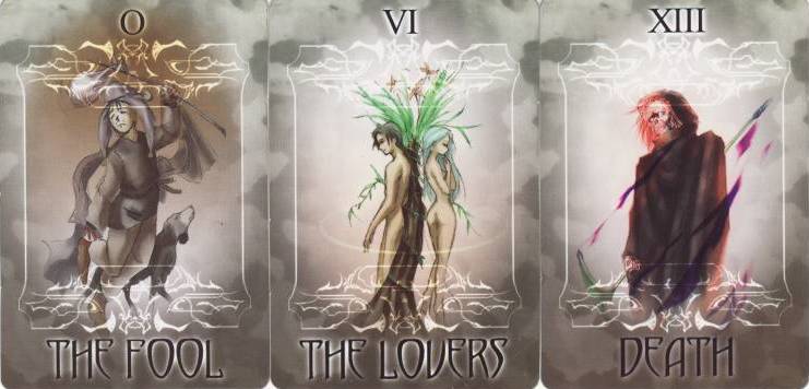 7th May 2007 A few days ago I received a copy of a tarot I had been trying to find for a number of years - the Entropy Tarot by Shigeki Gomi. This always intrigued me since seeing it in Kaplan's Vol III. I always wanted to have a deck so that I could try and see what these weird card designs were about. The illustrations in Kaplan are too small to see the detail, as are the few scans shown on the internet. 'Entropy' is a rather misunderstood concept that lies at the basis of thermodynamics, though Gomi uses it in a more general sense. The cards themselves are in a monotone bluish-purple and have diffuse forms which seem to be created using an airbrush. Many of the backgrounds depict stellar or galactic dust clouds while the foreground forms are, for the most part, abstract and geometrical, though there are figurative images on some cards. I cannot immediately grasp the meaning of each of the images, though I find references to Feyman diagrams (from Quantum physics), and form and order set against diffusion and chaos. It is Gomi's idea in 1983 that the world was degenerating into disorderly chaos through the increase in entropy but that if we meditated upon and worked with these ideas we could hold back this disorder in all spheres of human life and society. A grand idea, if somewhat elevated and impractical, but it has created a rather challenging tarot deck, that will puzzle us all for years to come. ![]() Synchonicitously, the day after I received this deck, I was in Edinburgh and was drawn to a fantasy art bookshop. There, amongst a multiplicity of dragons, fairies, dark gothic, and the sofly erotic artwork of Royo and Vallejo, I found Dave McKean's book of Minor Arcana of his Particle Tarot. I had not even realised that this had been published. I have the first book of the Major Arcana, which is a series of powerful modified photographs reflecting the Major Arcana within a framework of the idea of the fundamental particles of modern physics, quarks, muons, electrons, etc. Of course I have just published the Quantum Tarot majors which also deals with these ideas. All this immersion in modern physics made me wonder just how many tarot decks there are which are inspired by the theme of modern physics, or even science in general. We immediately recall that Ernesto Solari made the Le Macchine di Leonardo and Il Caduceo di Alessandro Volta tarots on historical science themes, but there will be more that come to mind given a little thought. 3rd May 2007 I have decided to make a start to listing my collection of tarot cards under their country of publication. Somehow this seems important to me. It will take a few weeks to complete this as though most can be done from memory there are quite a few I need to look up. I think it is quite useful to see the decks in this way. 3rd May 2007 Over the past few months I have been lucky to acquire a number of Korean tarots. Some of these were designed for young children, but among these are some rather more interesting items. One of these is the majors only tarot included with the computer game Tempest produced by the company Soft-max. This went on sale in Korea in December 1998, but in 2000 was revamped for the Taiwanese and Japanese market. The original version came on four CD-Roms with a booklet (in Korean) and the set of tarot cards. Tarots associated with computer games are sometimes difficult to acquire as there are many collectors of computer games and consequently the price can be rather higher than one would wish, but that is because of the fact that there are many people chasing a few items. Often these tarots reflect too much the imagery of the game and have almost no tarot content, but the Korean Tempest tarot is very much a tarot deck. The imagery is set, rather attractively, within a muted brown border with cloud like forms, in which is a complex linear structure framing the images of the cards. The Fool is conventional, tripping along with his dog and his bundle. The Lovers are placed facing in opposite directions with their backs to a central tree. Death is a rather severe skeleton in a dark robe. The packaging contains a rather evocative quotation from Shakespeare's Romeo and Juliet Eyes, look your last!