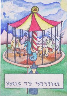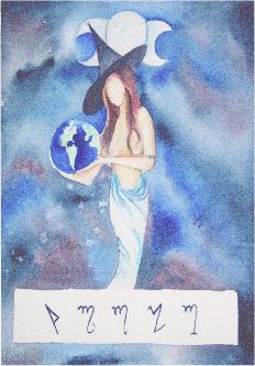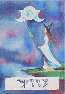 17th Aug 2007 I have now received the Theban Tarot created by Beth Seilonen in the USA. This is one of the ACEO cards (the standard format Art Cards Editions and Originals). Often people seem to start a tarot in this format but never follow through and complete the project. Luckily Beth Seilonen had the creative impulse and will to complete it. Theban, to Beth Seilonen, is the script used by witches. It was popularised as such in Gardnerian witchcraft but comes from Renaissance magic, being found in Agrippa's De Occulta Philosophia. Beth Seilonen's designs draw on this witchcraft theme. The Fool wanders under a horned moon, the Wheel of Fortune is a carousel of animals, while the World has our witch holding the Earth globe. The artwork in watercolour, without the usual pencilled underdrawing showing, is wonderfully evocative.