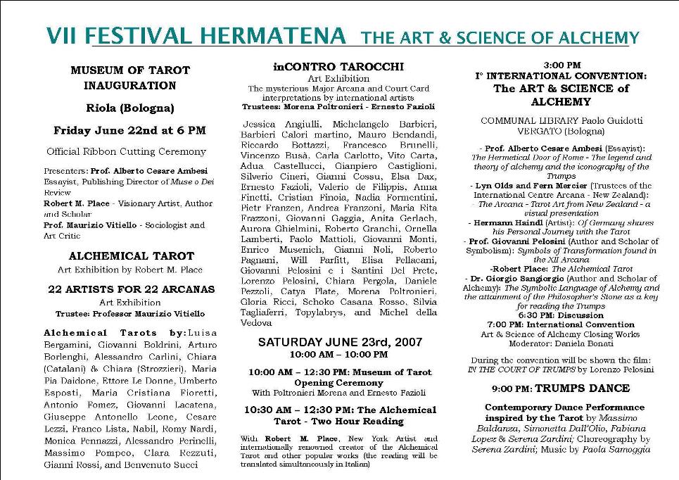 Arms, take your last embrace! and, lips, O you The doors of breath, seal with a righteous kiss A dateless bargain to engrossing death! ![]() 2nd May 2007 The Museo dei Tarocchi (Museum of Tarot) in Riola (near Bologna in Italy) is celebrating its public inaugeration in June with a festival conference over the weekend of June 22 - 24th on the theme of the Art and Science of Alchemy. Robert Place will be one of the presenters. There will be some lectures, visual presentations, music and even some puppetry. ![]() ![]() At this event the prizes for the IV HERMATENA AWARD 2007 on the theme of 'IN THE COURT OF THE TRIUMPHS: TAROTS THROUGH POETRY, FICTION, ESSAY, GRAFIC AND PHOTOGRAPHY' will be awarded. The first prize will be a rather generous 1000 Euros. 2nd May 2007 I have been waiting a long time for Robyn Tisch Hollister's Tarot of the Midnight Masquerade and it has just arrived today. I immediately realised why I had had to wait so long. This deck is hand made and comes with an amazing wooden box which has hand painted images on it. The box calls to mind Arnell Ando's individual collaged boxes, or those of Anissa Morello's Medieval Tarot, or Kimberly Fordham's Toscano. I can see how much work has gone into making the Tarot of the Midnight Masquerade deck and box so it is not surprising that it takes so long for Robyn Tisch Hollister to make up these hand crafted items. ![]() 1st May 2007 As a collector of tarots I always get rather excited by something unusual. Today the Namoo Tarot, also called the Midnight Tarot, arrived. It is a rather fine manga tarot in Japanese style produced in Korea in 2006 by silverforest, but what is rather intriguing is the fact that the homepage for the deck is in Tonga. The little white book is written in Korean so I am unable to make anything of it, but could it be that this deck was created on the Pacific archipelago of Tonga? Perhaps the artist lives there. It seems that the deck has been issued under other names, so it may be that this has nothing to do with Tonga, but it is intriguing.