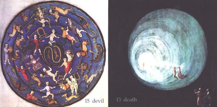 It would be wonderful if even a few of these hundreds of unpublished designs could be issued as actual printed decks. 21 Feb 2008 Yesterday I put up the image on a plate resonant of tarot. Today perhaps you might like to see an image of the Wheel of Fortune from an early medieval illuminated manuscript, the Hortus Deliciarum (Garden of delights), written in the late 12th century by Herrad of Hohenbourg, the Abbess of Mont-Sainte-Odile. This was a sort of illumined encyclopaedia of instruction for novices in the order. This image was created around 1180 nearly 300 years before the first painted tarot cards were produced. It makes us realise how the tarot imagery arose out of the emblematic imagery that evolved in European art.