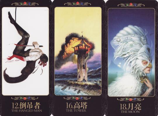 28 Mar 2008 A number of Chinese publishers have in the last few years issued boxed tarot decks primarily as a vehicle to showcase the work of various graphic artists. Today I received a copy of the Artist Tarot also named Artworks Tarot issued in 2007, which I have only just heard of a few weeks ago. Unfortunately the accompanying book is entirely in Chinese so I cannot identify any of the artists or the sources from which their imagery was taken. If I interpret the second page correctly it is a list of seven artists contributing to the tarot. It is, however, fantasy art, probably used in graphic novels, anime, computer games, CD cover art and so on. One can see a number of distinct styles. One artist depicts human bodies with extremely well defined musculature (the Fool, Death and the Hanged Man) while another loves to depict ornate masks/headresses (the Moon and the Sun card). I also rather liked the Tower. It is a full set of 78 cards in the elongated format favoured by Chinese publishers, based on traditional card shapes. The pip cards are not emblematic and all suits have the same background of flames. The Courts are fully emblematic in a conventional way but using scenes from fantasy art. The book has a few of the images in their original context, so we see that the art on some cards has been cropped from larger artworks in order to focus on tarot related symbolism.