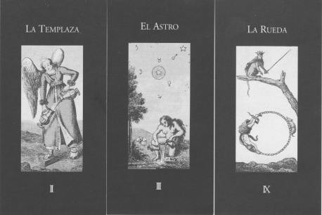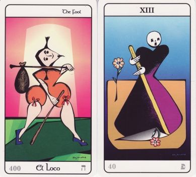 23 June 2008 Over the weekend I sold two more copies of the Alchemical Emblem Tarot, leaving only one copy left to sell from the edition. This is the first of my Art Tarots to sell out its edition and this has taken just over two years. Other tarots in my series will doubtless follow. I will not be reissuing decks as some publishers do. I produce limited editions of 100 signed and numbered copies only and will stick with that. There will be no second editions. I prefer to spend my time producing new decks, as there are many, many interesting art tarot designs out there that should be printed up in the form of a deck. If people want to own one of my Art Tarots I advise them to buy as soon as the deck comes out, rather than waiting till it is about to sell out its edition, as this will ensure they get a copy and they could even take advantage of the discount I give on the first 20 or so copies sold. With the deck I am about to publish in the next few weeks, I already have more than twenty advance orders so it could sell out quite quickly. 20 June 2008 I have been able to spend some further time over the last few days building up my database of Japanese tarots. It does take a lot of time researching and identifying items, but once I finish this it will be a firm foundation on which to build my exhibition. Now I have not just a pile of decks, but a body of organised information. There are so many themes to explore. Japanese tarot is remarkably diverse. 16 June 2008 In the last couple of days I have begun some preliminary work on the Art of Japanese Tarot exhibition. I always like to start early as it is very difficult to work tup against a tight deadline. The first stage is to conceive the exhibition as a narrative, and this requires me to look at all my Japanese tarots and find a way of linking these into a coherent structure for the exhibition. I decided to make a detailed database of the material so I can immediately find items and see them in different contexts. It does burn up a surprising amount of time creating a database as each entry needs a little research, though more detailed research will have to follow, when I move on to writing the catalogue sometime in the autumn. The database will probably take amost of the next week to complete as I have to fit it in to my other work. 10 June 2008 I found this set of 22 interesting tarot designs as illustrations in a Spanish book by Octavio Aceves, Tarot para meditar (tarot for meditation), published in Madrid in 1991. The illustrations are by Federico Gallego Ripoll and are drawn in pen then splattered with textured colour (perhaps using an airbrush, a really attractive effect. Some of the images present a new creative envisaging, for example, the Tower being stabbed with a pair of scissors, and the Magician's table as a playing card, and with human legs. There is a strong continuity of style throughout the images.