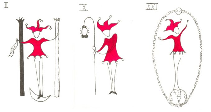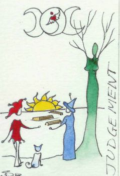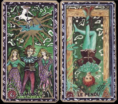 18 Dec 2007 Every now and again some artist gets so enthused and engaged by tarot that they quickly create a range of decks. The american artist Beth Seilonen is a recent example. I first came across her work in her Theban tarot which I bought in August this year. Then came her Indigo Witch in a similar style, but in the last month or so she has issued some simple line art decks, some with colour. These are the Dancing Dragonfly Arcana, the Arcana of the Tree People and the wonderfully expressive Arcana of the Red Jester. Luckily I have been able to buy a copy of each. At the moment she sells them on Ebay under her sellers name treepeopleart. It is rather good to see in her work the evolution of various approaches to representing the tarot arcana. She also runs the Cat’s Eye Gallery in Calais, Maine where she exhibits paintings not necessarily related to her tarot work.