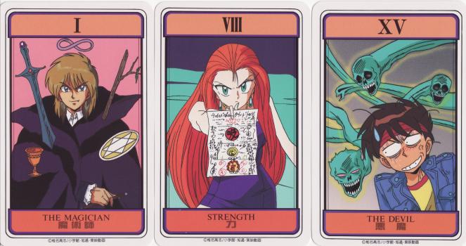 1 April 2008 Back in 1994 in Japan the TV anime Ghost Sweeper Mikami was very popular. I have acquired a set of 22 tarot cards related to this anime. These were no doubt created much more recently, but as I don't read Japanese I cannot decipher the date. The card designs are classic manga style and the designs seem to show various characters from the show. In Ghost Sweeper Mikami we are taken into a world where demons and spirits run amok. The world is saved from these demons by Mikami Reiko, a smart and sexy female exorcist. GS Mikami has a moderately large cast of characters: Okinu-chan, a spirit of a shrine maiden unable to leave this world; Emi, a rival shamanistic exorcist; Meiko, a shy girl who uncontrollably releases Shinigami from her body when upset; the immortal and mad scientist Dr. Chaos and his android helper Maria; half-vampire Peitro; Mikami’s mentor and Catholic priest Father Karasu, the narrator who is a hand puppet, and others. These cast members form the basis for the various misadventures of Mikami.