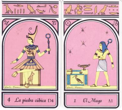 8 Apr 2008 I was very lucky recently to have been able to obtain a copy of the Apologia del Libro de Thot, Barcelona, Editorial Barath, 1980. This is a large format art tarot printed using silk-screen (serigraphy). The artist was Suarez and his Egyptian style tarot images are printed using silkscreen onto 13 by 7 inch thick card. A commentary on the symbolism of the Book of Thot by someone called del Pozo, is printed in gothic or black letter script on interleaved card, and the whole set of cards is then provided in a black folder. I have long been looking for a copy of this, but it was always too expensive, however, a week or so ago I got lucky and was able to get it on a Ebay auction at a price I could afford, possibly because I was the only bidder. In essence it seems a relatively conventional Egyptian style deck. I have not yet had time to examine it in detail to see if there are special features to the artwork or symbolism. What distinguishes it for me is the silk-screen printing (nowhere near as finely done as the Kashmir Tarot) and the size of the cards. Each card is signed and numbered, which considering that it was produced in an edition of 999 would have taken Mr Suarez some weeks to complete had he felt he had to number all the decks at the outset! 22,000 signatures and numberings. I hope he just did this as he sold each individual deck.