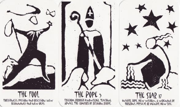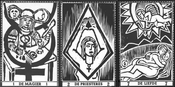 It is not easy to scan these at a small size as the artwork relies on one being able to see all the layers of detail. The Star, for example is primarly derived from photographs of a planetarium projector seen through images of fish from an aquarium. The little image I show hardly does this justice. It was not inexpensive, but is a rather fine art tarot issued in 2004 in an edition of 200. 15 July 2008 Today I received a tarot in a book that I have been searching for over the last year. This is a series of woodcuts by Andre Kerkhoven illustrating a book of poems (in Dutch) by Paul Rodenko. This was published in 1979 in the Hague. The illustrations are litho printed but the originals were woodcuts. The follow the usual imagery but with a few interesting variations. Coarse woodcuts does provide an unusual yet powerful medium for tarot imagery. It was not an expensive purchase.