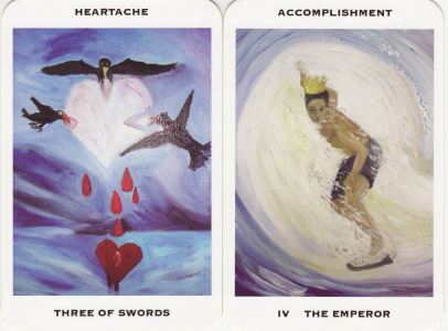 17 August 2008 I recently bought a copy of the new Tarot of Inner Peace created by Hedy Maimann as a series of oil paintings on canvas. Her imagery is to a great extent unique to her conception, though recognisably reflecting the usual image we have of the arcana. Some are quite puzzling. Consider Judgement which shows a couple crouching close to the ground and seemingly trying to lay out a large pieced jigsaw puzzle. The Emperor is shown as a surfer wearing a crown. The pip cards have emblems which do follow the Pamela Coleman-Smith imagery though completely re-envisioned by Hedy Maimann. For example, instead of using the usual image of the sword, which probably carries a negative 'unpeaceful' image she represents this air suit by using birds. With the pentacles she similarly avoids money inages, and instead uses circular floral bouquets. In her painting she uses thin layers of paint except in some areas where she builds up quite a high impasto, especially in white pigment. This is an unusual deck but archetypally tarot. She includes an extra card which she assigns to arcana 22. This is called Pandora's Box and refers to its myth, in which at the bottom of the box which Pandora foolishly opened, was found 'hope'.