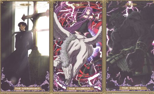 14 Feb 2008 I just received a rather fine Japanese tarot issued in 2005 which seems to be called the Fate Tarot or possibly the Demour402 Tarot. This appears to be based on illustrations by Shuuji Tsuyadashi for the Japanese doujinshi (fan art) group Demour402. I am not at all sure of the sources for these images, but I feel sure they will be familiar to people who know Japanese manga. I am not sure whether these images were created as a tarot or have been chosen from a some comic books series. The Hierophant, Lovers and Chariot for example are classic tarot images, but other are a little more peripheral, or perhaps unique envisagings of a tarot image - the Hanged Man or the Tower for example are quite unusual. Rather than being a high building the Tower is a giant armoured figure striding across the landscape. They would appear to be by the same very skilled artist. I am told that this is a self published deck. The quality of the artwork is very high.