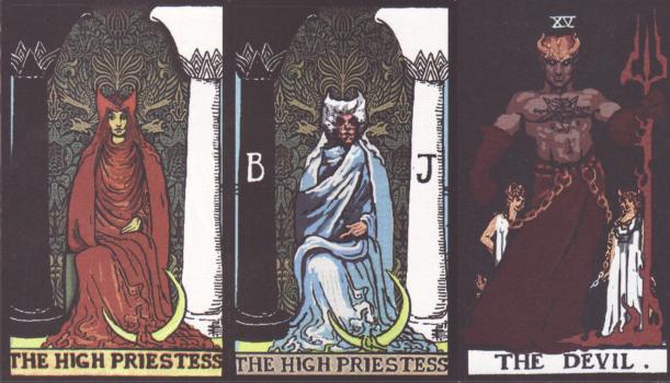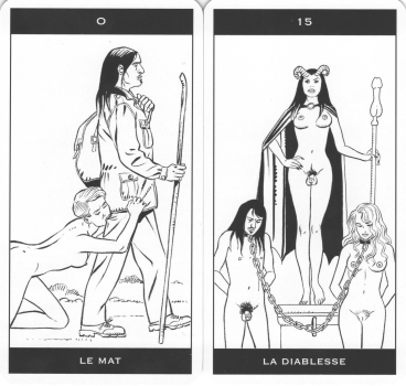 29 September 2008 This weekend I began the production of the latest in my Art Tarot series. If I am not interrupted by other work, I should be able to complete this on Wednesday or Thursday. I takes about a week to print, laminate, cut, prepare the boxes, and make up the sets of cards. Following my normal practice, I will not make an announcement until I have the decks ready to ship. 27 September 2008 The Tarot de Jeebee is a black and white Majors deck published, I am led to believe, in 2002. The deck is subtitled "Domination -Soumission", and is an erotic deck, though only mildly porongraphic by today's standards. The artwork, pen drawings, was by the Belgian comic book artist Denauw Renaud, especially known for the adult comic book series Jessica Blandy. I was amused by the Fool where instead of a dog, Renaud depicts a woman biting the Fool's leg. The Devil is shown as a transexual, with phallic staff, presiding over the naked male and female figure. The imagery is subtly humorous, rather than overtly pornographic and a rather tasteful addition to the growing number of erotic tarot decks.