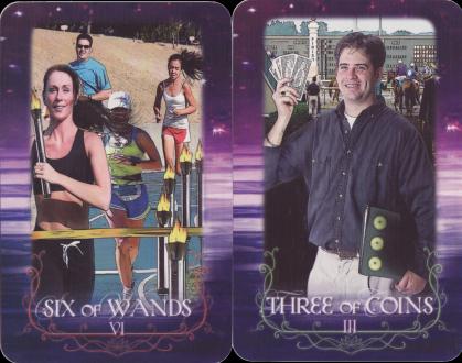 28 Nov 2007 There have been a number of dark decks issued recently, but tarot is not all about dismal, or horrific images of the terrible fate awaiting us. I am still expecting the Catastrophic Climate Change Tarot which may be a bit delayed, I believe! Instead, today a rather jolly deck arrived to brighten my day with its wonderfully happy images. This is the Tarot of the Lotus Circle, produced by one of those amazingly positive American organisations devoted to healing. I am sure my natural cynicism would rapidly make me tire when reading their literature, but I can resonate with the images in their deck. They have a delightfully original Fool, skipping along, blindfolded and holdinng an umbrella. I also found the Devil rather amusing, as here it is depicted through smoking and drinking, an obvious 'devilish activity' for a healthy lifestyle. If you want cheering up just get out this deck and have a look through its images. I am not always sure if the images chosen are tongue in cheek as with the playful Postmodern PoMo deck of Brian Williams. The Six of Wands as the relay race, could be either a neat joke or related to the health aspect of exercise through sport - I cannot decide. ![]() ![]()