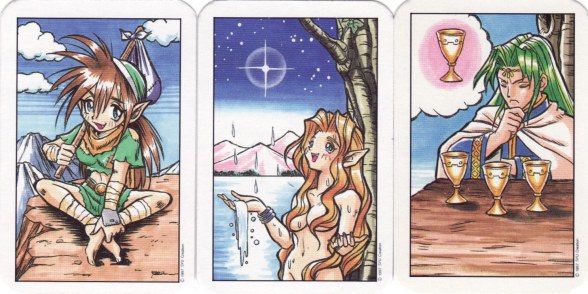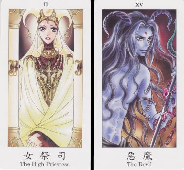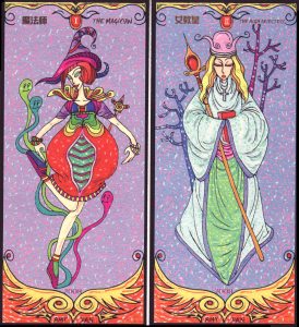 2 May 2008 Taiwan is a major source for tarot. I have recently received the Marvellous Tarot. This is aimed at younger children and it has the familiar female figures with the large appealing doe eyes, and the male figures depicted with the convention of sharp features, the angular chin and the narrow almond shaped eyes. Though rather conventional and unadventurous in its symbolism, this deck is nicely drawn and a very good example of the style.