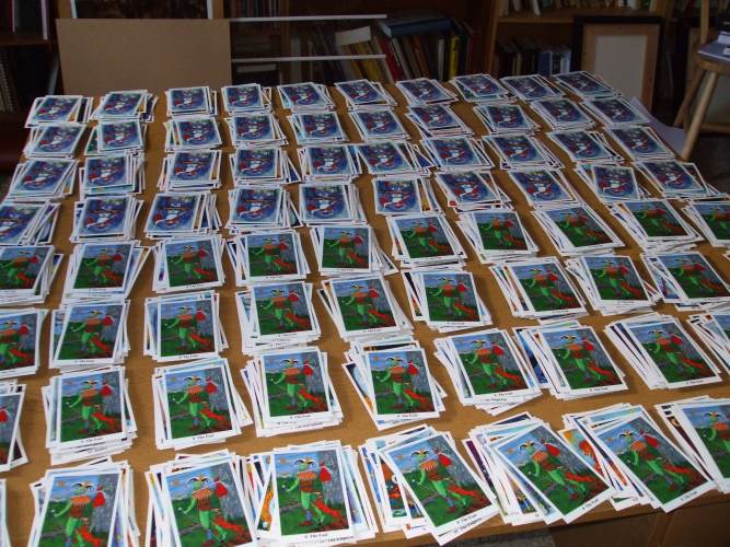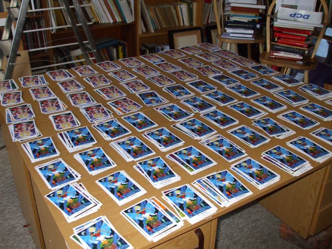 14 July 2008 I have had a good response to my latest tarot publication the Arto Tarot by Jane Estelle Trombley. This Canadian artist seems to have a considerable number of friends and supporters who wanted to make sure they got a copy of her deck, so I have sold 30 copies in just a few days. The sales will no doubt drop off a bit, but people obviously recognise the skill, creativity and power of her art. 11 July 2008 This morning I wrote the text for my tarot mailing list posting. I suddenly realised that this is the first mailing for about six months. This is because I had not been able to find the time to work on publishing new tarots early this year as I had to devote my time to other projects in order to pay the bills. Publishing obscure though delightfully creative tarots does not make any money and absorbs hundreds of hours of my time. If I ever were to properly account for the time I spent working on each deck from beginning to end I would be devastated to see how little I was paying myself an hour. Of course the artists do even less well, as they must spend so much more time creating their images in the first place. Anyway, I struggle on and will be announcing the publication of more items in my Art Tarot series in the months ahead. Hopefully, I will send out the mailing list later this afternoon. 10 July 2008 Two of my Art Tarot Series have sold out recently - the Alchemical Emblems and the Aleph have now sold their editions. I will now, no doubt, get many emails from people wanting copies. Sadly, so many people leave purchasing to the last minute and then they miss out. I am not going to reprint items - I intend to use my energies and capital to continue to publish new tarot decks rather than reissuing material I have previously published. A limited edition is just what it says - limited to 100 copies only. A few other of my decks are selling quite quickly. I expect many will be sold out within two to three years of their initial publication. 8 July 2008 This morning I began making up the most recent deck in my Art Tarot series. This is the delicious Arto Tarot of Jane Estelle Trombley. Here are couple of pictures taken during the making up of the deck. I should complete this later today and now have this for sale through this page where you can see more samples of the cards.