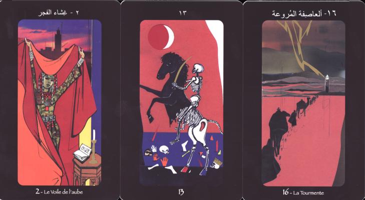 4 Dec 2007 Le Tarot de Marrakech is a set of 22 large cards together with a paperback book. Despite the name, it is published in France, and is the collaborative creation of Georges Colleuil with the painter Jean-Baptiste Valadié. The cards have for the most part been renamed, though immediately recognisable. Thus the Star is 'La Croix du Sud' (the Southern Cross), the Hanged Man is 'l'Acrobat', the High Priestess is 'Le voile de l'aube' (the veil of the dawn). The titles are also given in Arabic, and here I think we have the conventional names for the tarot arcana. The cards are finely printed and consist of pen drawn outlines for the most part coloured with block colour including gold ink.