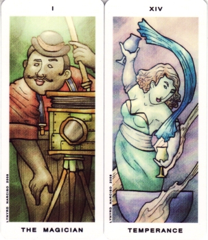 4 November 2008 Lynyrd Narciso's latest self published tarot has now arrived. He calls it the Moody Lane Tarot as a humourous reference to the early 20th century artist, Modigliani, from whom he took inspiration for the style of his designs for this deck. Lynyrd Narciso is a very talented artist and he can absorb the essence of a style and rework it in a fresh and original way. Here he captures the atmosphere of the early 20th century. I especially like the image of the Magician as photographer, and the art nouveau flowing forms in the Temperance card.