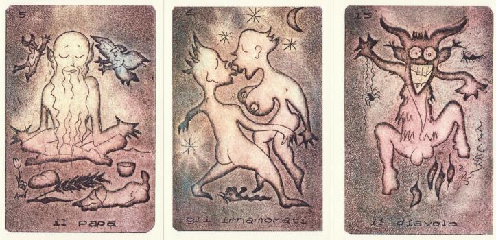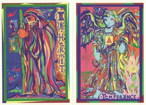 12 Mar 2008 The Museo dei Tarocchi in Italy has just issued I Tarocchi dell'iride (the tarot of the rainbow) by Claudio Parentela, an illustrator, painter, photographer, cartoonist, collagist, and prolific freelance journalist in the international underground scene, having produced many illustrations for magazines and books worldwide. His tarot deck is in a signed and numbered edition of 100 copies. The images are very busy, and brightly coloured, using for the most part unmixed colour (perhaps the idea of using a rainbow palette of colours). They are made to look like silk-screened art. The style, to me, is reminiscent of 1960's underground comic art, such as seen in Oz magazine. The images are quite conventional, though translated into and filtered through Claudio Parentela's style and method of working. You can see some of his other work, including the black and white pen drawings made for this tarot and others, on his website