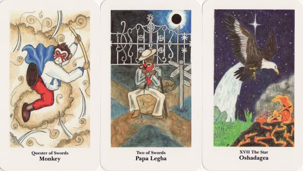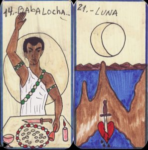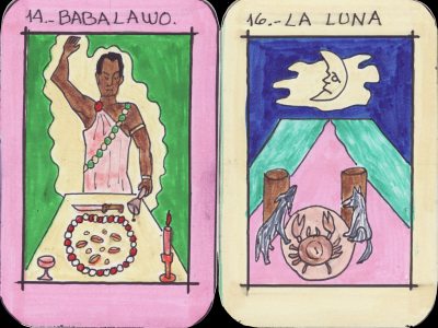 2 July 2008 For a very modest price I obtained two hand made tarot decks which seem to be based on the Santeria Afro-Caribbean religious tradition. I have no idea who made these. They are drawn using felt tip pen on a thin foil backed card. On examining the backs one can see a pressed outline of the image, suggesting that the outlines were made using considerable pressure, and thus that by using carbon paper between a stack of blank cards, multiple copies could have been produced. The lines were then strengthened using the felt tip pen and the various parts of the images coloured also with felt tips. So I suspect it may be that the creator of the cards made more than one copy. The cards in each of the two decks are given the names of the Orishis or Gods in Santeria, but these are made to correspond quite closely to traditional tarot imagery in many cases (though not in the classic order). The more square rectangular deck has 25 cards, while the more elongated one has 30. The imagery on each deck does closely relate in many of the cards, but other do have distinctly different images. I don't suppose I will ever find out anything else about these decks. The artwork is naive but very appropriate to the subject, possibly even been made by someone practising Santeria. I find these rather elemental and more alluring than the many rather polished mass market decks on this subject, such as the Tarot of the Orishas, Tarot Lukumi and Afro-Brazilian Tarot.
