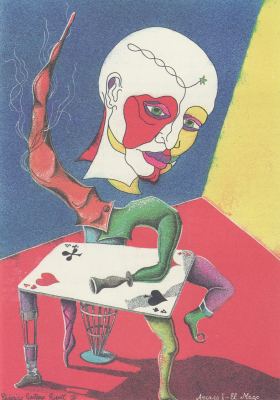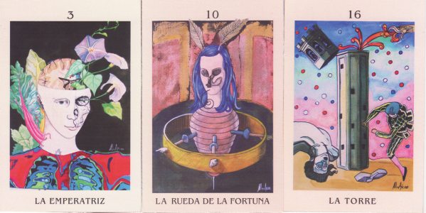 24 June 2008 Earlier this month I managed to obtain a interesting set of surrealistic designs for tarot cards as illustrations in a Spanish book by Octavio Aceves. I now have, again from Spain, another set of surreal tarot cards self-published by another Spanish artist. I don't yet know the title of this deck but I am so impressed by it that I will buy a small batch of copies and sell these on to my fellow collectors.