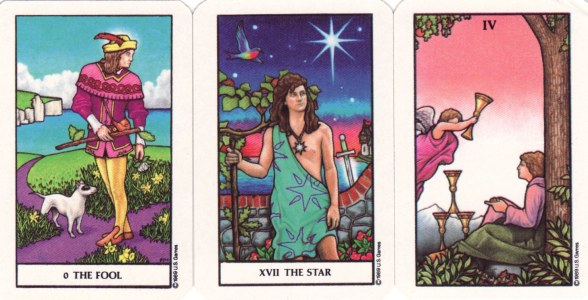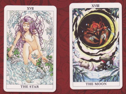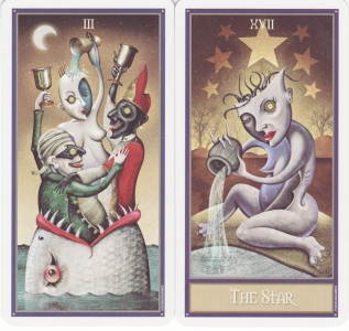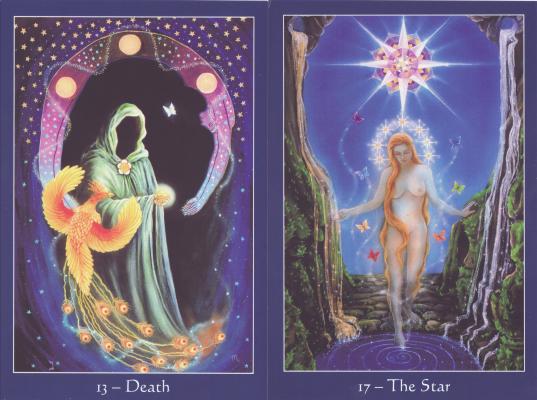 9 Apr 2008 Being a painter myself, I do have an especial liking for painted tarots, so today it was quite a treat to receive the american artist Cathy McClelland's The Star Tarot Deck. This has obviously been an enormous work of will for Cathy McClelland. She actually began working on the tarot images back in 1991, and it took her about three months to complete each tarot painting. By 1996 she had only completed five card images. The other demands of her life must have gotten in the way but in 2005 she returned to her task and eventually in 2007 she completed the twenty two paintings and had these printed as a deck. The cards are very large (6.7 x 4.5 inches -170 x 115mm) and this allows us to see all the details of her original paintings. She paints using acrylics but also uses airbushing to create smooth gradations of tone. The deck comes with a paperback book which outlines her approach to the symbolism. The artwork is wonderfully detailed in saturated colours, and the way some of the forms are modelled makes them appear to glow out of the surface of the card. These little scans do not do the images justice, you will have to buy a copy to appreciate this artwork fully.