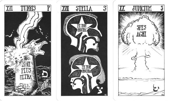 6 June 2008 I have obtained another rather obscure black and white tarot, drawn in ink with pen and brush. This is from Denmark. I only have two Danish tarots so this is a good addition. This tarot is entitled Tarok: Arcana Majora Extensa conceived by Erwin Neutzsky-Wulff and drawn by Ole Christensen and published in 1986 in Copenhagen. As the title suggests it is an enlarged deck, with 34 cards. The first 22 correspond to the normal tarot archetypes, and the additional twelve relate to various gods and goddesses from different traditions, such as Demeter, Horus, Marduk, Odin and so on. Some of the imagery for the majors is quite conventional while some is rather idiosyncratic. Thus the Tower corresponds to the conventional, while the Star with its star form inside the human brain, and the apocalyptic atomic explosion of Judgement are new twists on the imagery.