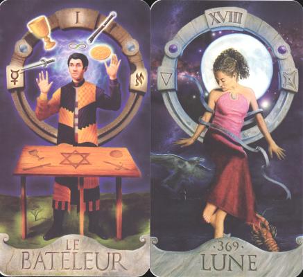 7 Apr 2008 This morning the postman woke me up with a package from Amazon France. This contained some books I had ordered and a new tarot Tarot sanctum : le grimoire des initiés by Marie-Renée Patry, which comes in a large solid box, which includes a book. The 22 card deck was created by Pierre Foisy. The cards are large and printed without borders. They are presenting tarot as a magical system rather than a divinatory one, so the book deals with all sorts of ways of incorporating tarot imagery into magical ritual. The card designs are for the most part entirely conventional though beautifully worked in a coherent artistic style. Each image (apart from the Wheel and the World) have a textured background on which a circular form is set within the top half of the card space. This bears the card number and its astrological glyph and associated magical symbol. The tarot arcana are then set as the foreground image. The artwork are painted in richly saturated colours, probably in acrylics, with rather good modelling giving a deep three dimensionality. The figures stand out well from the backgrounds and are painted in considerable detail.