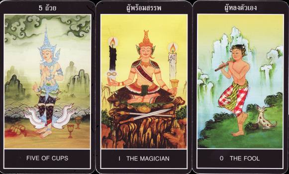 3 June 2008 Today I received a new tarot from Thailand - which raises my Thai tarot collection to four. This is a 78 card deck based on Thai Buddhist imagery. The artwork is beautifully detailed with the outlines of the human forms made in red ink line, and subtly and sensitively coloured. The minors are emblematic and follow the imagery of the Rider-Waite, though located in Thai Buddhist imagery. This deck is a delightful addition to my collection.