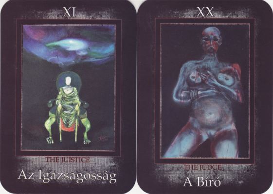 30 October 2008 Sorry, I have not had much time over the last few days to update this weblog despite having received a number of interesting decks. Put it down to too much bookbinding. There are not many Hungarian tarots. I only have four, well five now, as a few days ago the artist Vivien Kabar kindly sent me her recently published tarot based on her paintings. The cards are large in order to allow space for the images which vary in size. The imagery is deliciously dark. Some of the cards are based on paintings created as tributes to the British painter Francis Bacon. Here is Judge (XX Judgment) and The Juistice (XI Justice).