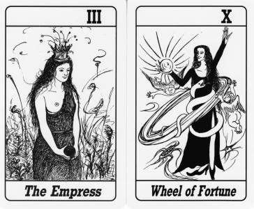 4 August 2008 I recently bought copies of two tarots from Japan both named Love Tarot and both by the same designer, Addams Anna Majoeria. The first was issued in 1999 and consists of black and white pen drawings. These are rather individual and have some nice humourous touches. The Wheel of Fortune is quite original.