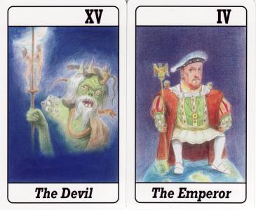 5 August 2008 Addams Anna Majoeria's second Love Tarot has just been issued this year. The art is in soft coloured pencil. The book shows the pen and wash originals from which, no doubt, the final coloured versions were made. Here we see a rather fine Japanese devil. For the Emperor she uses a stylised portrait of King Henry the Eighth. I have not seen that before.