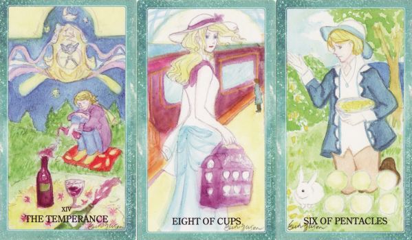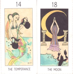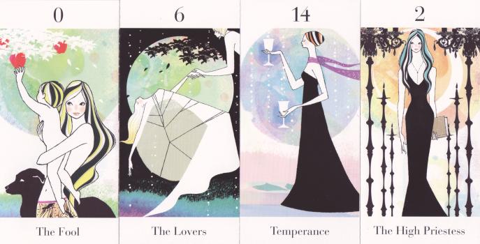 30 June 2008 In the last few days I have received a number of really interesting tarots, which I will post up here on my weblog over the next week or so. I will begin with a rare little set of small cut-out tarot cards issued with a 2002 issue of the Japanese fashion magazine An.An. The art, in pen and watercolour, is rather stylish. The artist signed each card 'Kao' but I have not been able to identify this person. Such giveaway cards, though often issued in large quantities with a magazine, are now extremely rare and difficult to source. Most would have been thrown away when the next issue of the magazine appeared. I think I must be one of the very few collectors interested in these items. The artwork is often, as in the case of the An.An furoku, of surprisingly good quality and originality. Here we have a rather nice new take on Temperance and The Moon.