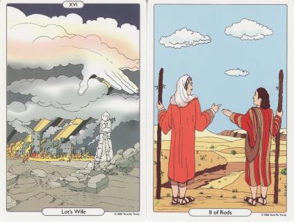 13 September 2008 I have been away all week at the Chymia 2008 conference in Spain. I got back to a mass of emails and letters which I have now to answer and deal with. Thus I have not been able to keep up the weblog over this past week. I will try and put up some new postings this week. 4 September 2008 Last week I bought the Tarot - The Ancient Translation Tool produced in the USA by Tracey. This inexpensive deck is professionally printed on standard thin varnished stock and produced using a computer drawing program. The artwork is in thin line and subtly coloured in solids and gradient tones, with no attempt at modelling, which produces rather nice clean and crisp images. The imagery draws from the Biblical Old Testament. Thus Aaron is the Magician, Abraham the Hierophant, Adam and Eve the Lovers, Samson Strength, and so on. The Majors, are for the most part depicted with original ideas, though cloely related to the standard tarot imagery, but the Minors draw clearly from the Pamela Coleman-Smith emblematic imagery. I found the Tower rather original, it showing Lot's wife turned into the pillar or tower of salt.