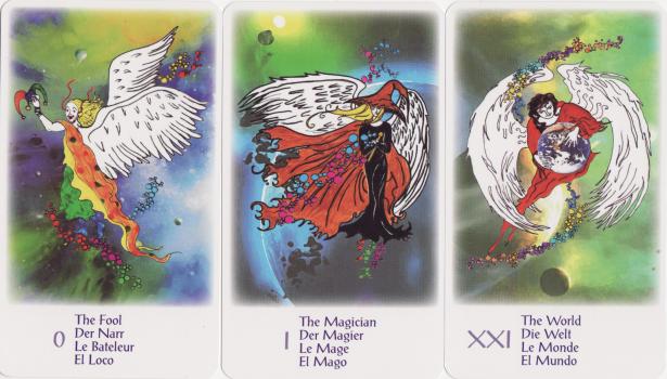 5 Dec 2007 Angel tarots are rather numerous. I ran out of fingers and had to take off my shoes in order to count the ones I have. So it was not at all surprising that I missed one that was recently published by AG Muller. The artwork is by Nikita Arnett and Lydia Oukhaneva and is in a cartoon style drawn with heavy pen outline. The angels wings are left uncoloured and the image is coloured using a digital airbrushing tool, which produces rather interesting and unusual tones and textures. The angels all seem to be walking or suspended in space and often have strings of coloured bubbles under their feet. This deck has a naive and rather childlike style, though the images are attractive and engaging enough.