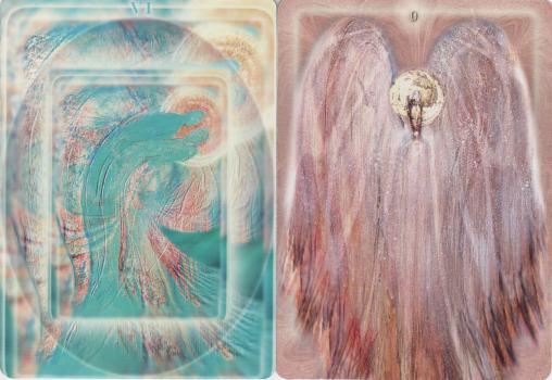 11 November 2008 Due to the vigilance of a fellow tarot collector and the assistance of a Polish friend, I am now the possessor of the Tarot Aniolow (Tarot of Angels) created by Mayron in 2007. This is a set of 24 cards - the 22 Tarot Majors plus a card 0-22 and an unnumbered card. The cards have no titles. The artwork is ethereal and impressionistic, based on original paintings which are printed within a diffused filter which makes the periphery of the cards soft and out of focus while the centre remains sharp. These appear to be in oils, as impasto is used on many of the paintings. Each depicts an elongated angelic form which reflects the tarot imagery. Some of these associations are merely hinted at, while others immediately strike one. The Lovers is obvious and the Fool a little more enigmatic.