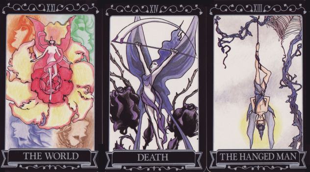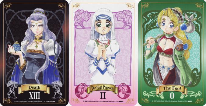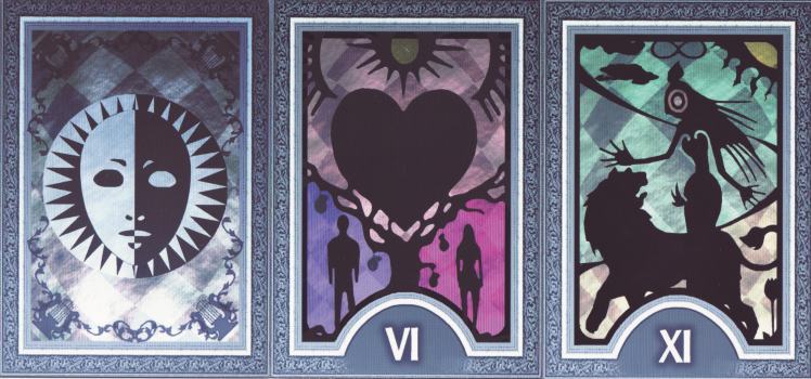 17 Nov 2007 I have recently acquired the Japanese PlayStation Persona 3 Tarot, which was a promo deck given to people who pre-ordered the Persona 3 game of 2006 directly from the Japanese Playstation website. It is consequently rather hard to find and therefore expensive, but will make a good addition to my Japanese collection. In the long term this can only get rarer and rarer as it does not often find its way into the hands of tarot enthusiasts. The designs are like silhouettes or shadow puppets set against a luminous coloured background and are for the most part minimalist. One sees from the design on the card backs the essence of the design concept, the interplay of darkness and light, negative and positive forms. The Lovers shows us a bleeding heart set in a tree, while Strength has the female figure like a shadow puppet dominating the lion. The effect is almost like modern stained glass (not the leaded traditional art form). The hero of the actual computer game is attacked by Shadows. This awakens his Persona, Orpheus, his only chance for defeating these creatures of the night. He learns of a hidden time that exists between one day and the next, swarming with Shadows. In the game the main character battles with others against the Greater Shadows, who have traits and appearances similar to those of the first twelve Major Arcana of the Tarot. He encounters an entity who refers to himself as Pharos, and who is really the incarnation of Death, the thirteenth Arcana. So we can see that these cards relate partly to the actual substance of the game itself. My deck was unopened still tightly sealed in shrink wrap, probably discarded by someone more interested in the Playstation game to even bother opening the set of cards.
