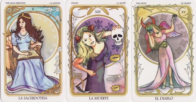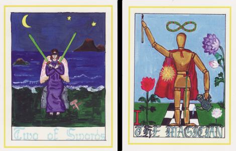 30 July 2008 Sorry for the short gap in the weblog. It was not that I had any lack of material but rather a lack of free time for me to write anything. During the last few days I have received a number of tarots. Among these is a self published deck by Tamara Nikolic which she has entitled The Visionary Tarot. It is essentially a Rider Waite clone complete with emblematic minors. It appears to have been painted in gouache or acrylics. The Majors use those artists' jointed mannikins to depict the figures. One remembers this device was used in Osvaldo Menegazzi's Il Fantastico Viaggio di un Manichino. The Visionary Tarot is an edition of 100 numbered copies. Although self published, the cards have been professionally printed. Strangely these appear to be printed using screen printing as the colours are in distinct layers, but this may just be an artefact of a particular litho printing press.
