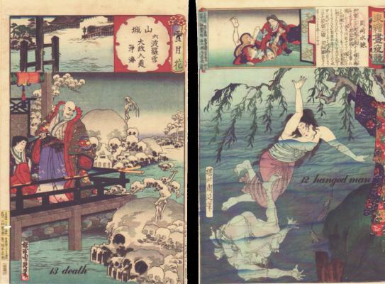 22 Jan 2008 Today I received a copy of the Teen Titans tarot. This is based on the DC Comics superhero comic books issued back in the mid 1960's and still going strong. This deck would appear to be produced by some fans of the Teen Titans and is probably an unofficial small volume self-publication, possibly a Doujinshi (fan art group). The cards are tall and thin, being 7.4 by 3 inches (187 by 76 mm). They are well printed on slightly glossy thin stock. There are 42 cards, the 22 Majors and the 16 Court cards, plus an extra 4 copies of the Fool. For those who know the comic book characters - Jericho is The Magician, Raven is the High Priestess, Troia the Empress, Risk and Prysm are the Lovers, Nightwing is Justice, Tempest as Temperance, Starfire the Star, Argent the Moon, Lilith is the Sun, Slade is King of Spades, and the Titans Tower is The Tower. The reason for the shape of the cards is to suit the elongated figures of these superhero characters. I am not sure if this is a Far Eastern production. The titles of some of the cards add the definite article to "The Temperance", "The Death", "The Strength", "The Justice" which a native English speaker would not do, and this suggests to me a Japanese, Korean or Taiwanese origin as I have seen this used on other cards from these countries. There is no documentation provided with the cards.21 Jan 2008 During the last few months I have often despaired about my tarot collection as it has grown so large that it was proving impossible to find a particular tarot when I needed access to it. A year or so back I bought a large plan chest and this was a good solution but it rapidly filled up and I resorted to the usual solution of piling new tarots up when they arrrived, so that it was difficult to locate anything. I was thinking of buying another plan chest, but when visiting the furniture store Ikea with a friend at the weekend I found a storage chest, A2 in size, with six shallow drawers, totally suitable for the various sizes of tarot deck. Though not inexpensive, I instantly decided to buy six of these, and pile them in two stacks three high. These were delivered today as flat packs, of course, that have to be assembled. It will take some days to do this, as I have so much to do at present, but I feel this will be a good solution. I plan to store the decks primarily under countries, with some under themes or publishers. That should make things easy to find. I feel sure this will solve my storage problems, though I may have to buy more in the future. 17 Jan 2008 Strangely, as in the best fairy stories, things often turn up in threes, so today a third tribute tarot arrived. This one, from the prolific Jason Lang in Canada, is based on 19th century Japanese prints by Yoshu Chikanobu (1838-1912). He produced several thousand coloured woodblock prints in a popular style dealing with the broad canvas of human life and his works are full of drama and characterisation. Of course, Chikanobu would have had no knowledge of Western tarot, but his subject matter is sufficiently broad as for it to be not too difficult to pick out prints or sections from prints which resonate with tarot archetypes. Jason Lang must have had some fun looking through all this material and settling on particular images. I just show the ones he chose for Death and the Hanged Man. Death is rather neat with its landscape and trees formed of human skulls. The print chosen for the Hanged Man remarkably shows a figure sinking upside down into deep water, a rather nice find.