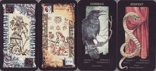 31 Jan 2008 Back in September last year I discovered that Didier Graffet had produced a set of Majors images for a French role playing game called Chimeres, created by Jean-Luc Bizien in 1994. At that time I was not sure if these designs had been issued as a actual deck or merely as images within this game. By great good luck a deck turned up on Ebay a week or so back and I was able to buy it and after a short wait in the post it arrived yesterday. The deck actually consists of two sets of cards - 22 Major tarot arcana and a set of 15 animal cards. The Majors have a central image of a line drawings of the familiar Tarot de Marseilles woodcuts. These are set in ornate borders which seem to reflect some aspect of the game. The animal characters are such archetypal images as the Crow, the Serpent, the Wolf, Owl, Black Cat, Dog and so on. I am not sure how they fit into the game.