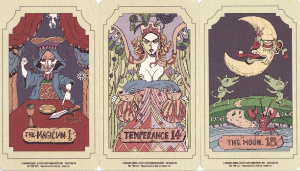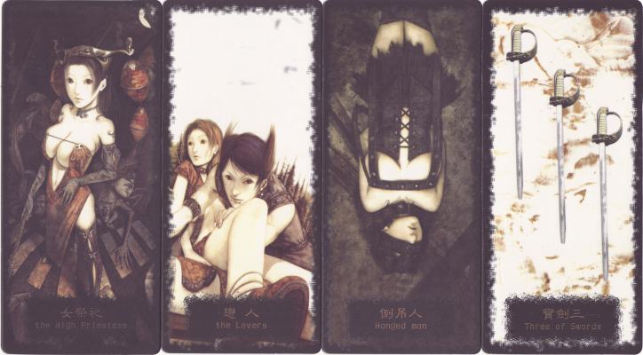 14 Nov 2007 Among the WOW! decks of 2005 was the totally delightful, contemporary, in-your-face, gothic, neo-symbolist, Lunatic Tarot of Evan Yi Feng. This Taiwanese deck was issued as a portfolio of large format 'cards' loosely bound on their top edge into a perfect bound book, so that it was easy to disassemble in order to have a set of large cards. The artwork was very detailed and really needed that large format. A year later the card designs were issued as a standard format deck with the cards being slightly cropped to fit the space. Now I have obtained a new Chinese deck which appears to use the images of Evan Yi Feng, and in particular incorporates some of the imagery from the earlier deck. It is, however, an entirely original creation, though drawing on the Lunatic deck.