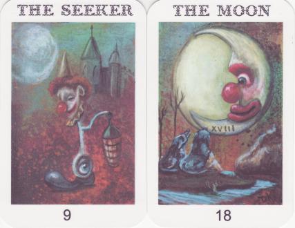20 August 2008 There is quite a tarot input from ACEO artists. This is a relatively recent art format. ACEO stands for "Art Cards, Editions and Originals". These cards have one main rule - they are 3.5 inches by 2.5 inches - the size of a trading card. These artists produce a wide range of subjects and styles and usually sell the originals on Ebay or some other trading system. A number of these artists have tried out some tarot images and some even complete a set of Majors. Debra Klopp-Kersey's Clown Tarot started out as ACEO cards, but she has now printed these out and issued them as a limited edition of 100 signed copies. Earlier this year she issued her Crow tarot which I bought for my collection. The Clown Tarot cards are a bit larger (about 5 by 3 inches). Her paintings are very powerful and she captures the sinister, the sad, the disturbingly wierd and surreal, as well as the conventional image of the Clown.